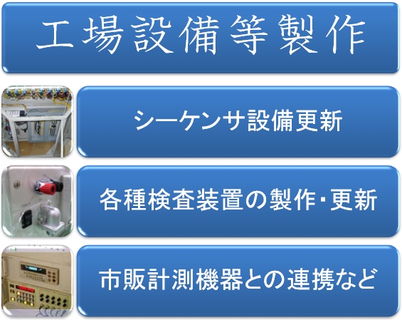 ・ 工場監視やシーケンサの更新、その他検査装置などの開発も行っております。 ・ 修理、更新を断られてしまった古い計測、検査装置などもご相談ください。 |